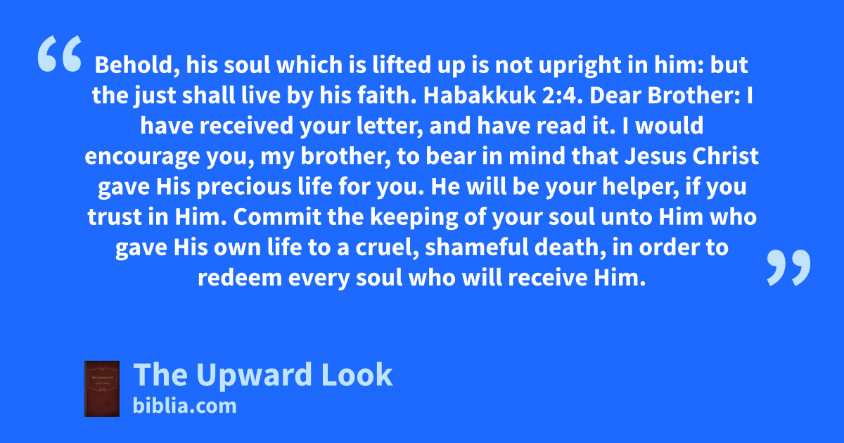 Behold, his soul which is lifted up is not upright in him: but the just shall live by his faith. Habakkuk 2:4. Dear Brother: I have received your letter, and have read it. I would encourage you, my brother, to bear in mind that Jesus Christ gave His precious life for you. He will be your helper, if you trust in Him. Commit the keeping of your soul unto Him who gave His own life to a cruel, shameful death, in order to redeem every soul who will receive Him.