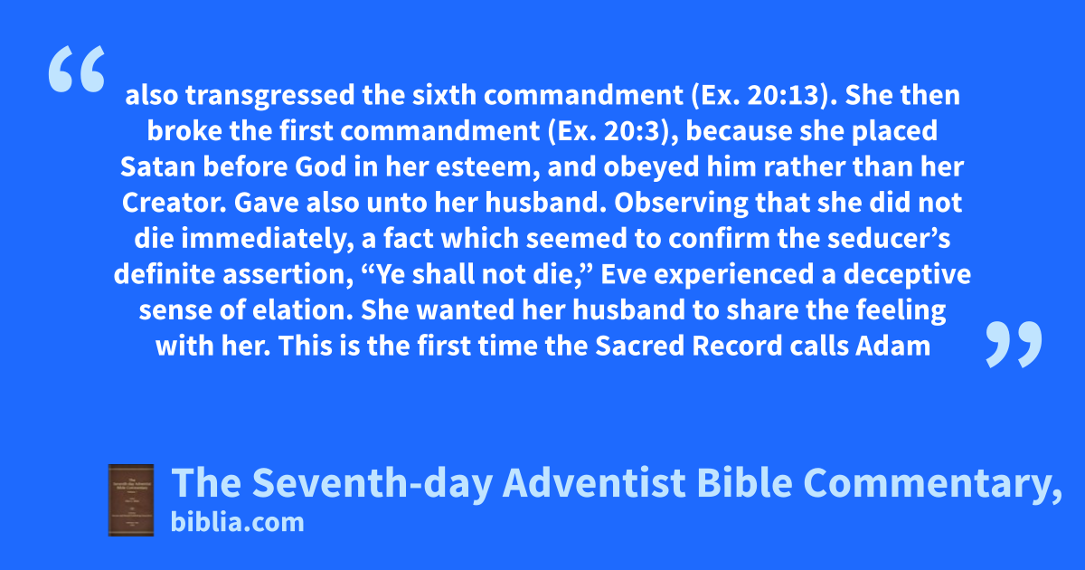 also transgressed the sixth commandment (Ex. 20:13). She then broke the first commandment (Ex. 20:3), because she placed Satan before God in her esteem, and obeyed him rather than her Creator. Gave also unto her husband. Observing that she did not die immediately, a fact which seemed to confirm the seducer’s definite assertion, “Ye shall not die,” Eve experienced a deceptive sense of elation. She wanted her husband to share the feeling with her. This is the first time the Sacred Record calls Adam