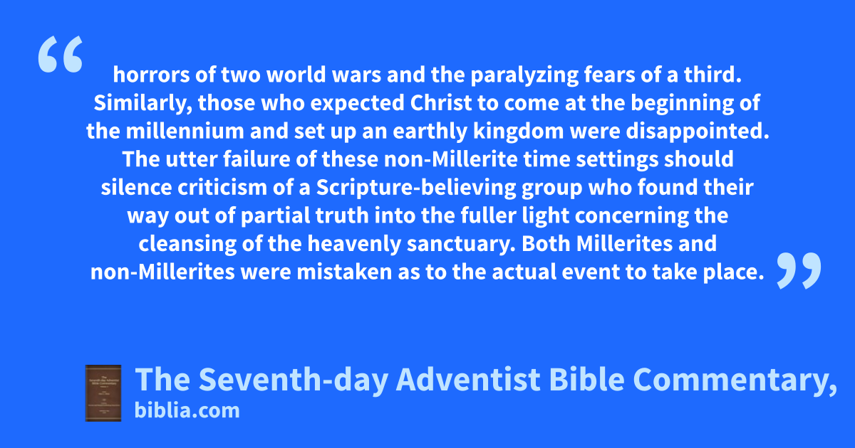 horrors of two world wars and the paralyzing fears of a third. Similarly, those who expected Christ to come at the beginning of the millennium and set up an earthly kingdom were disappointed. The utter failure of these non-Millerite time settings should silence criticism of a Scripture-believing group who found their way out of partial truth into the fuller light concerning the cleansing of the heavenly sanctuary. Both Millerites and non-Millerites were mistaken as to the actual event to take place.