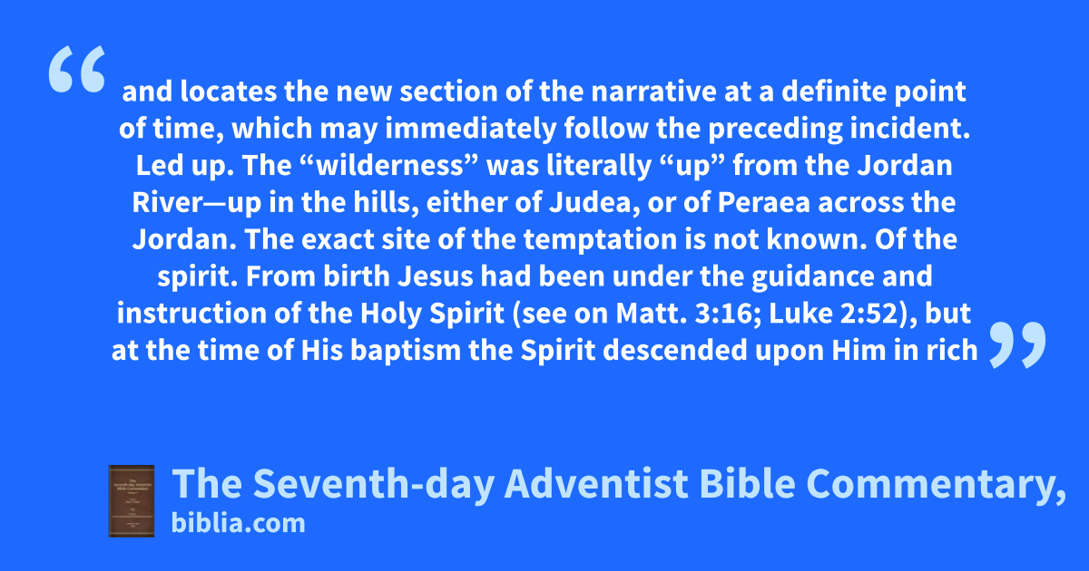 and locates the new section of the narrative at a definite point of time, which may immediately follow the preceding incident. Led up. The “wilderness” was literally “up” from the Jordan River—up in the hills, either of Judea, or of Peraea across the Jordan. The exact site of the temptation is not known. Of the spirit. From birth Jesus had been under the guidance and instruction of the Holy Spirit (see on Matt. 3:16; Luke 2:52), but at the time of His baptism the Spirit descended upon Him in rich