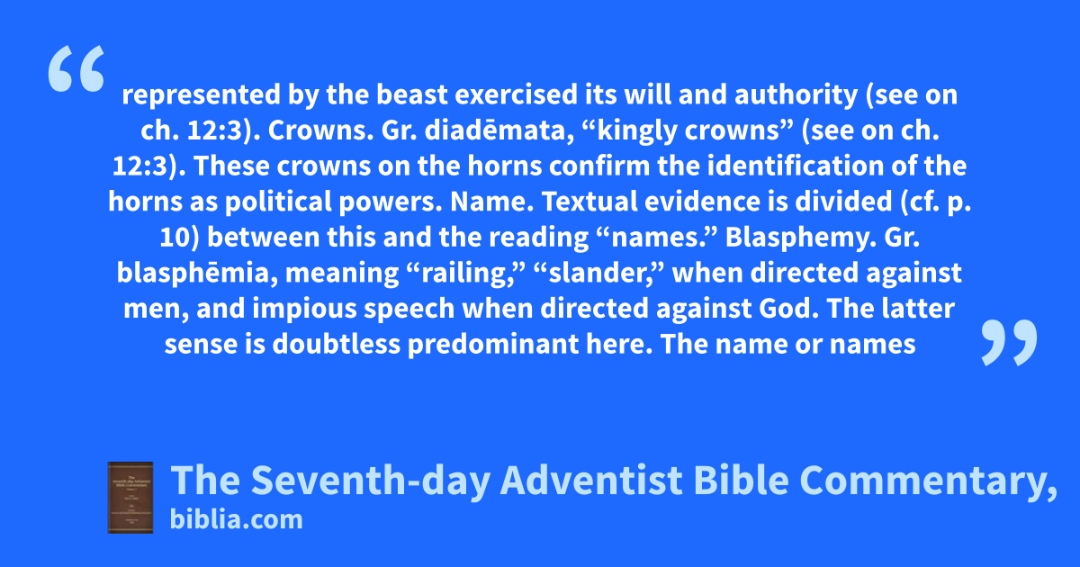 represented by the beast exercised its will and authority (see on ch. 12:3). Crowns. Gr. diadēmata, “kingly crowns” (see on ch. 12:3). These crowns on the horns confirm the identification of the horns as political powers. Name. Textual evidence is divided (cf. p. 10) between this and the reading “names.” Blasphemy. Gr. blasphēmia, meaning “railing,” “slander,” when directed against men, and impious speech when directed against God. The latter sense is doubtless predominant here. The name or names