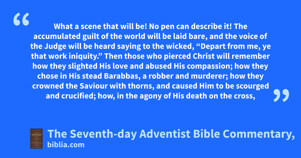 What a scene that will be! No pen can describe it! The accumulated guilt of the world will be laid bare, and the voice of the Judge will be heard saying to the wicked, “Depart from me, ye that work iniquity.” Then those who pierced Christ will remember how they slighted His love and abused His compassion; how they chose in His stead Barabbas, a robber and murderer; how they crowned the Saviour with thorns, and caused Him to be scourged and crucified; how, in the agony of His death on the cross,