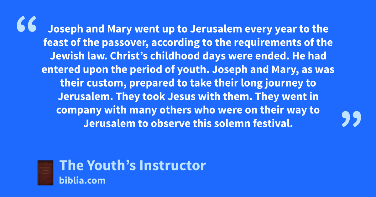 Joseph and Mary went up to Jerusalem every year to the feast of the passover, according to the requirements of the Jewish law. Christ’s childhood days were ended. He had entered upon the period of youth. Joseph and Mary, as was their custom, prepared to take their long journey to Jerusalem. They took Jesus with them. They went in company with many others who were on their way to Jerusalem to observe this solemn festival.