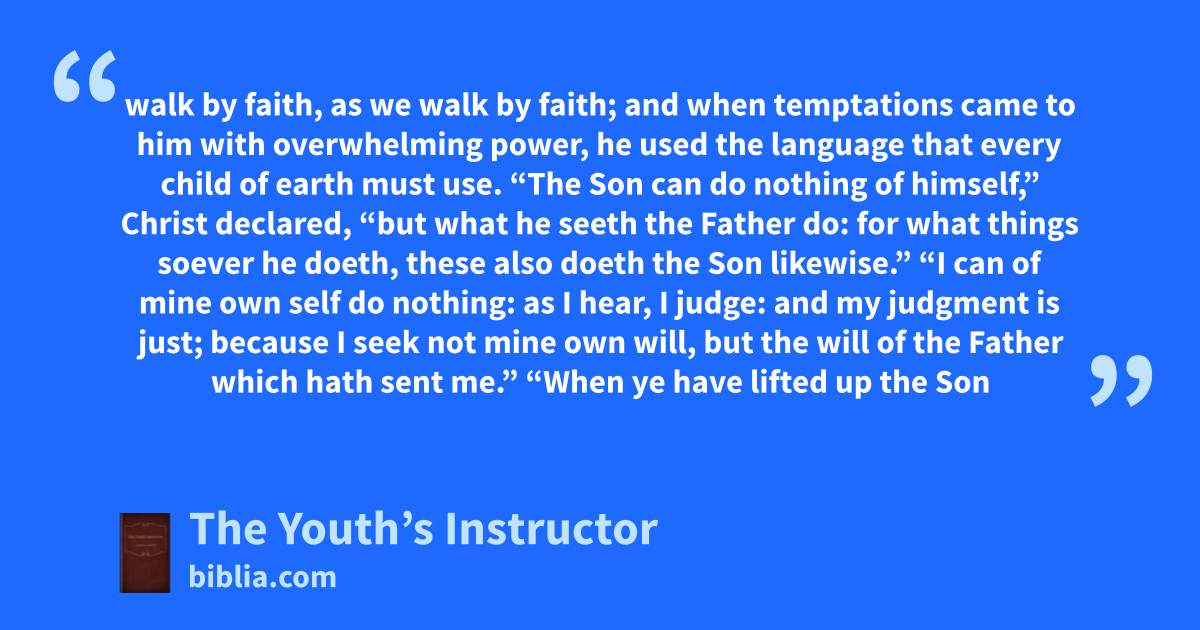 walk by faith, as we walk by faith; and when temptations came to him with overwhelming power, he used the language that every child of earth must use. “The Son can do nothing of himself,” Christ declared, “but what he seeth the Father do: for what things soever he doeth, these also doeth the Son likewise.” “I can of mine own self do nothing: as I hear, I judge: and my judgment is just; because I seek not mine own will, but the will of the Father which hath sent me.” “When ye have lifted up the Son