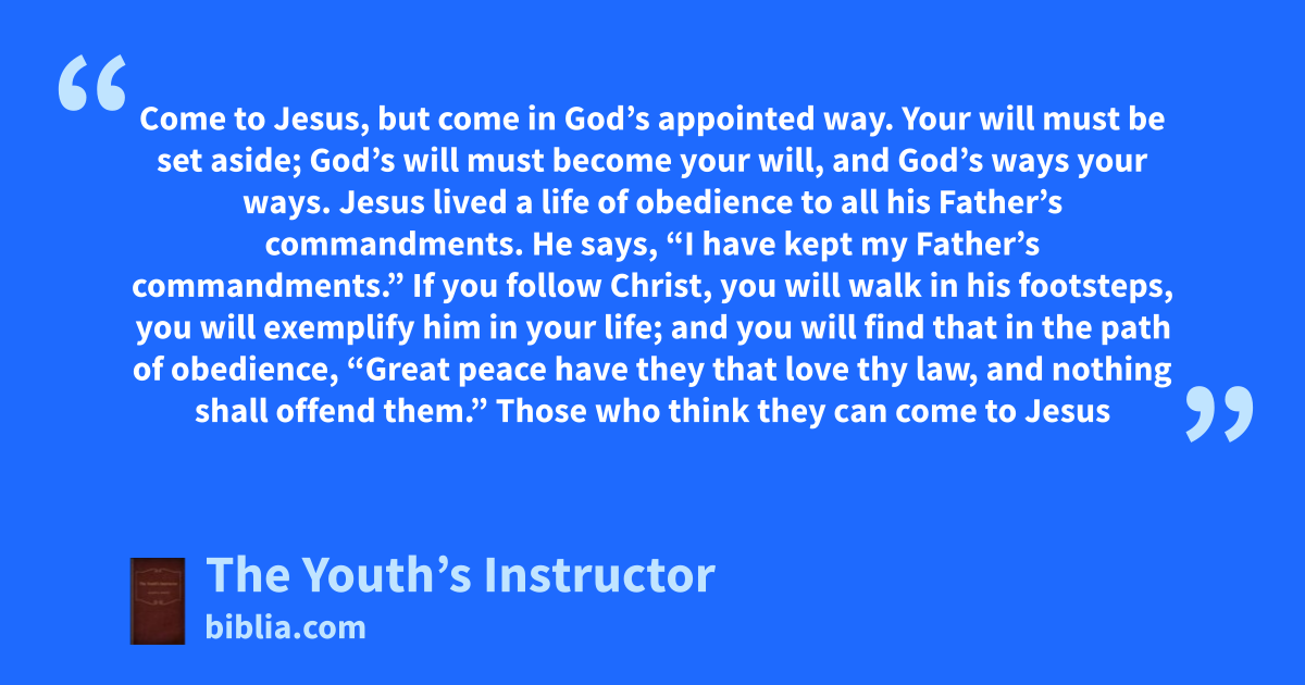 Come to Jesus, but come in God’s appointed way. Your will must be set aside; God’s will must become your will, and God’s ways your ways. Jesus lived a life of obedience to all his Father’s commandments. He says, “I have kept my Father’s commandments.” If you follow Christ, you will walk in his footsteps, you will exemplify him in your life; and you will find that in the path of obedience, “Great peace have they that love thy law, and nothing shall offend them.” Those who think they can come to Jesus