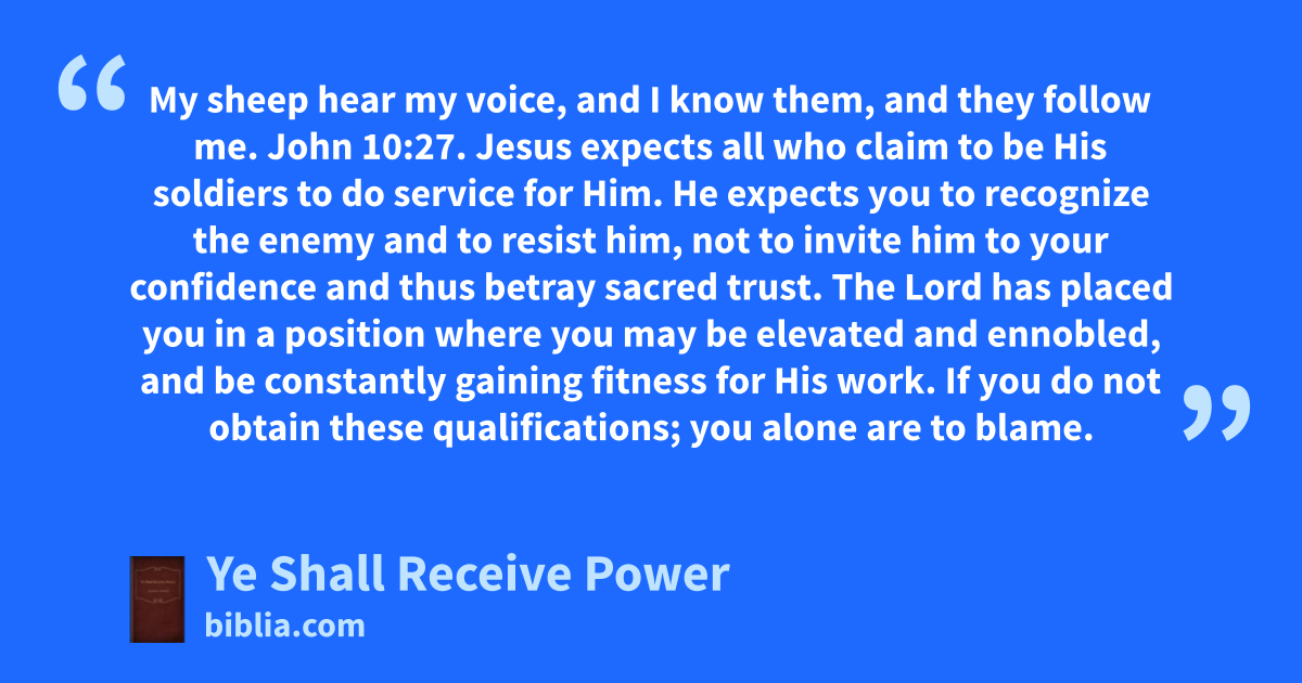My sheep hear my voice, and I know them, and they follow me. John 10:27. Jesus expects all who claim to be His soldiers to do service for Him. He expects you to recognize the enemy and to resist him, not to invite him to your confidence and thus betray sacred trust. The Lord has placed you in a position where you may be elevated and ennobled, and be constantly gaining fitness for His work. If you do not obtain these qualifications; you alone are to blame.