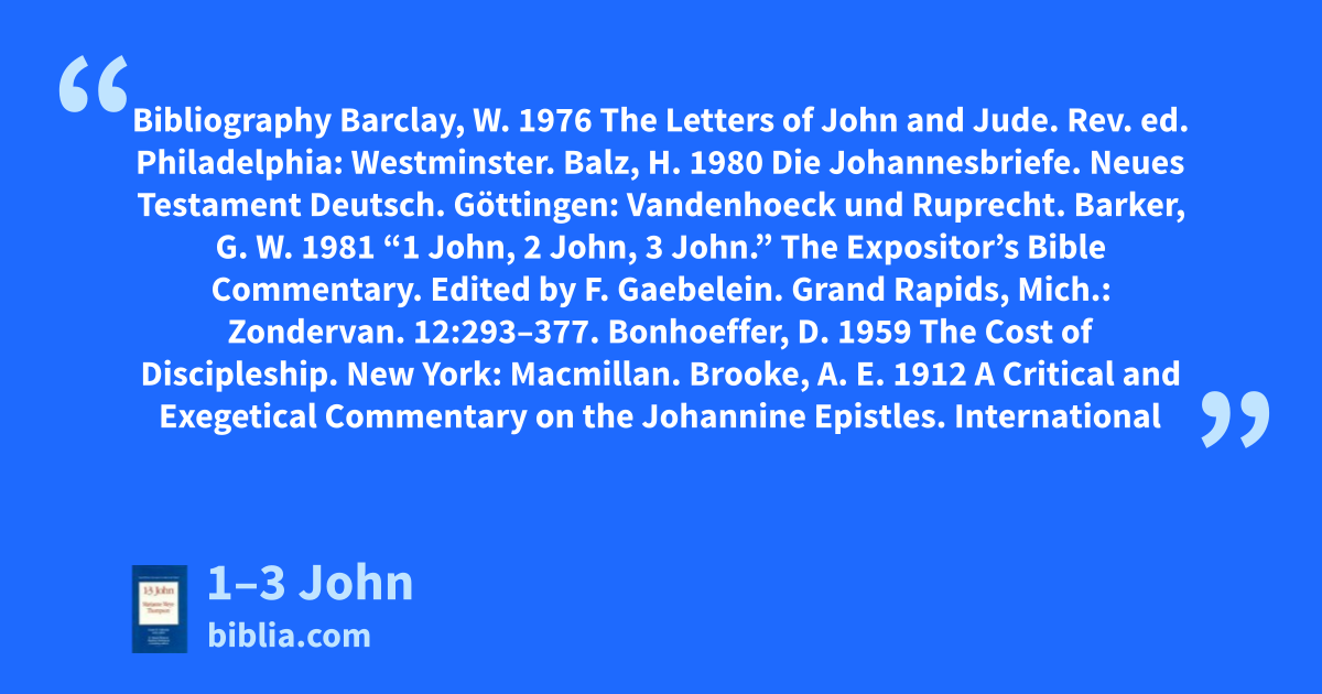 Bibliography Barclay, W. 1976 The Letters of John and Jude. Rev. ed. Philadelphia: Westminster. Balz, H. 1980 Die Johannesbriefe. Neues Testament Deutsch. Göttingen: Vandenhoeck und Ruprecht. Barker, G. W. 1981 “1 John, 2 John, 3 John.” The Expositor’s Bible Commentary. Edited by F. Gaebelein. Grand Rapids, Mich.: Zondervan. 12:293–377. Bonhoeffer, D. 1959 The Cost of Discipleship. New York: Macmillan. Brooke, A. E. 1912 A Critical and Exegetical Commentary on the Johannine Epistles. International