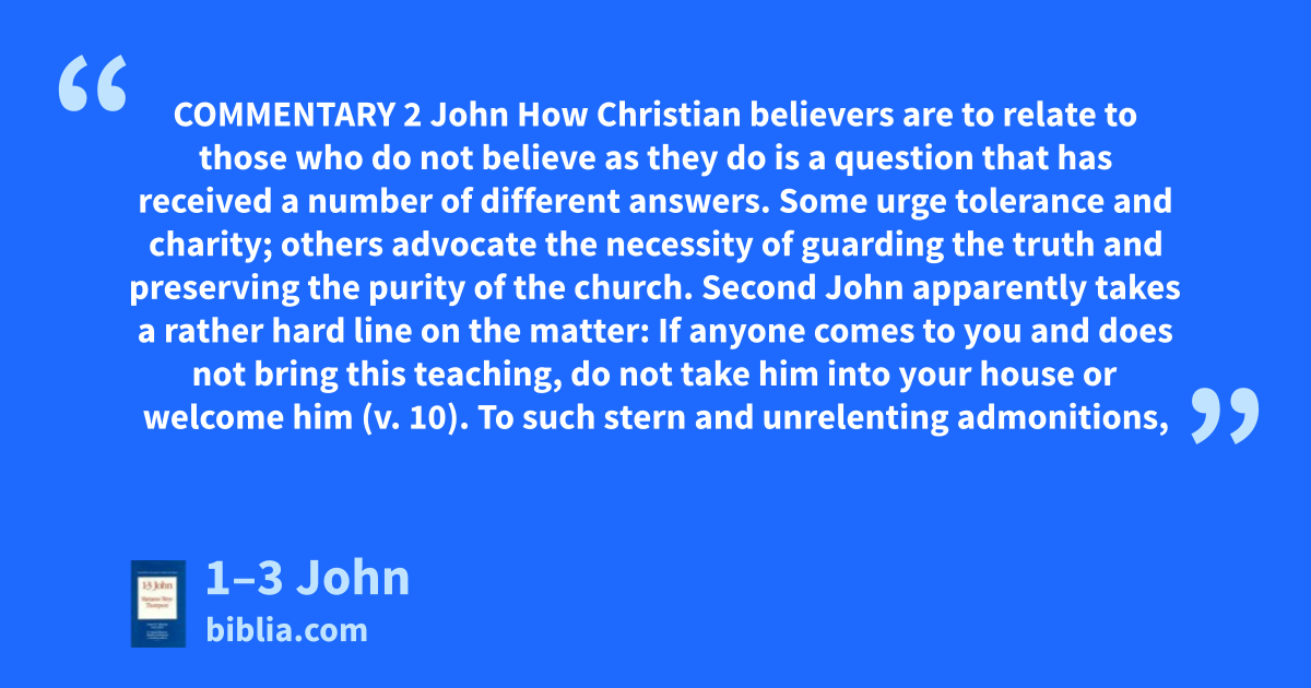 COMMENTARY 2 John How Christian believers are to relate to those who do not believe as they do is a question that has received a number of different answers. Some urge tolerance and charity; others advocate the necessity of guarding the truth and preserving the purity of the church. Second John apparently takes a rather hard line on the matter: If anyone comes to you and does not bring this teaching, do not take him into your house or welcome him (v. 10). To such stern and unrelenting admonitions,