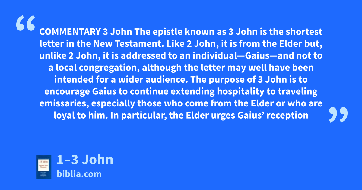 COMMENTARY 3 John The epistle known as 3 John is the shortest letter in the New Testament. Like 2 John, it is from the Elder but, unlike 2 John, it is addressed to an individual—Gaius—and not to a local congregation, although the letter may well have been intended for a wider audience. The purpose of 3 John is to encourage Gaius to continue extending hospitality to traveling emissaries, especially those who come from the Elder or who are loyal to him. In particular, the Elder urges Gaius’ reception