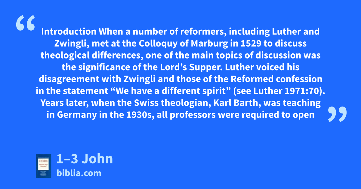 Introduction When a number of reformers, including Luther and Zwingli, met at the Colloquy of Marburg in 1529 to discuss theological differences, one of the main topics of discussion was the significance of the Lord’s Supper. Luther voiced his disagreement with Zwingli and those of the Reformed confession in the statement “We have a different spirit” (see Luther 1971:70). Years later, when the Swiss theologian, Karl Barth, was teaching in Germany in the 1930s, all professors were required to open