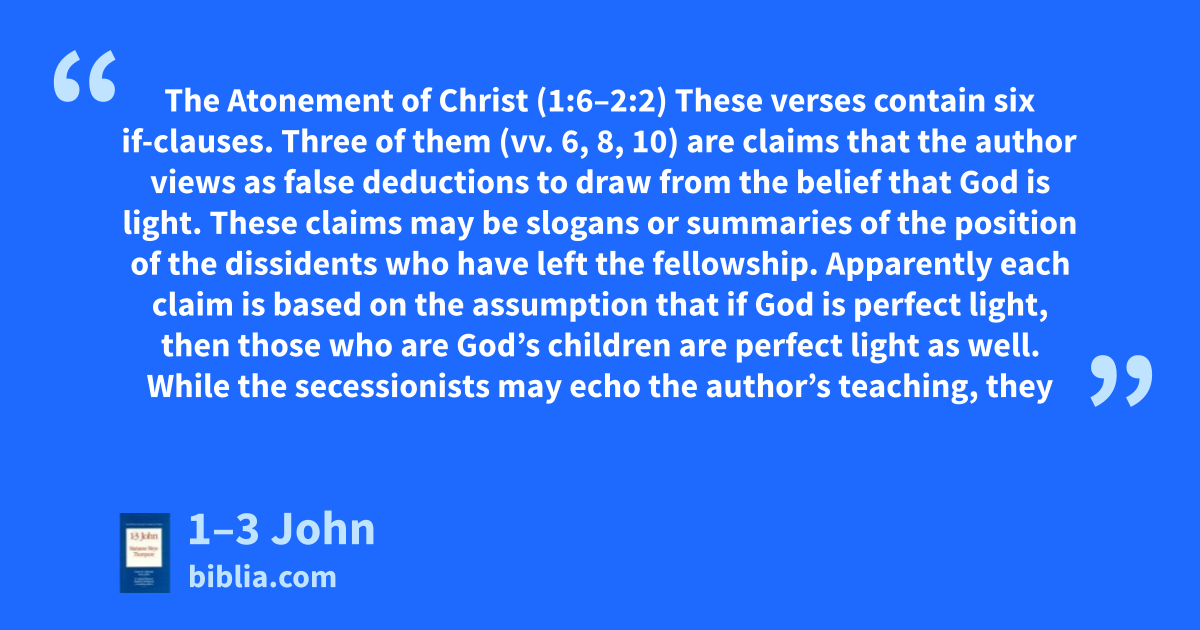 The Atonement of Christ (1:6–2:2) These verses contain six if-clauses. Three of them (vv. 6, 8, 10) are claims that the author views as false deductions to draw from the belief that God is light. These claims may be slogans or summaries of the position of the dissidents who have left the fellowship. Apparently each claim is based on the assumption that if God is perfect light, then those who are God’s children are perfect light as well. While the secessionists may echo the author’s teaching, they