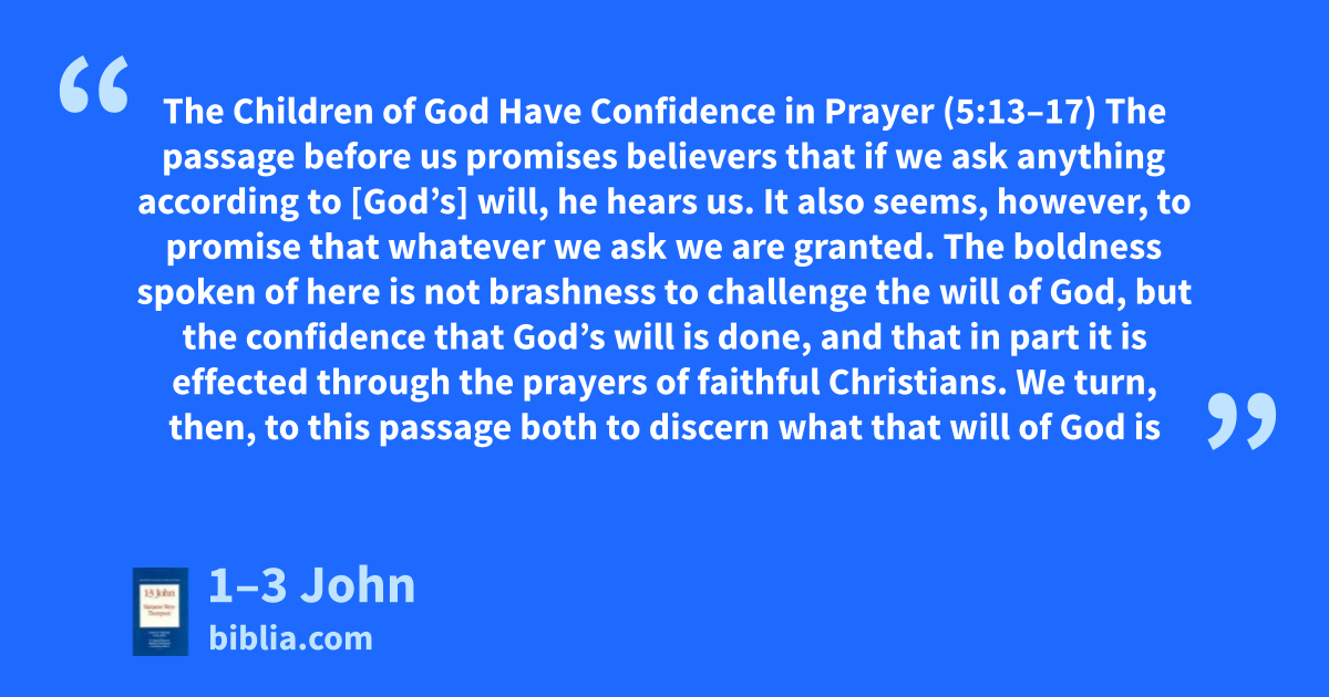 The Children of God Have Confidence in Prayer (5:13–17) The passage before us promises believers that if we ask anything according to [God’s] will, he hears us. It also seems, however, to promise that whatever we ask we are granted. The boldness spoken of here is not brashness to challenge the will of God, but the confidence that God’s will is done, and that in part it is effected through the prayers of faithful Christians. We turn, then, to this passage both to discern what that will of God is