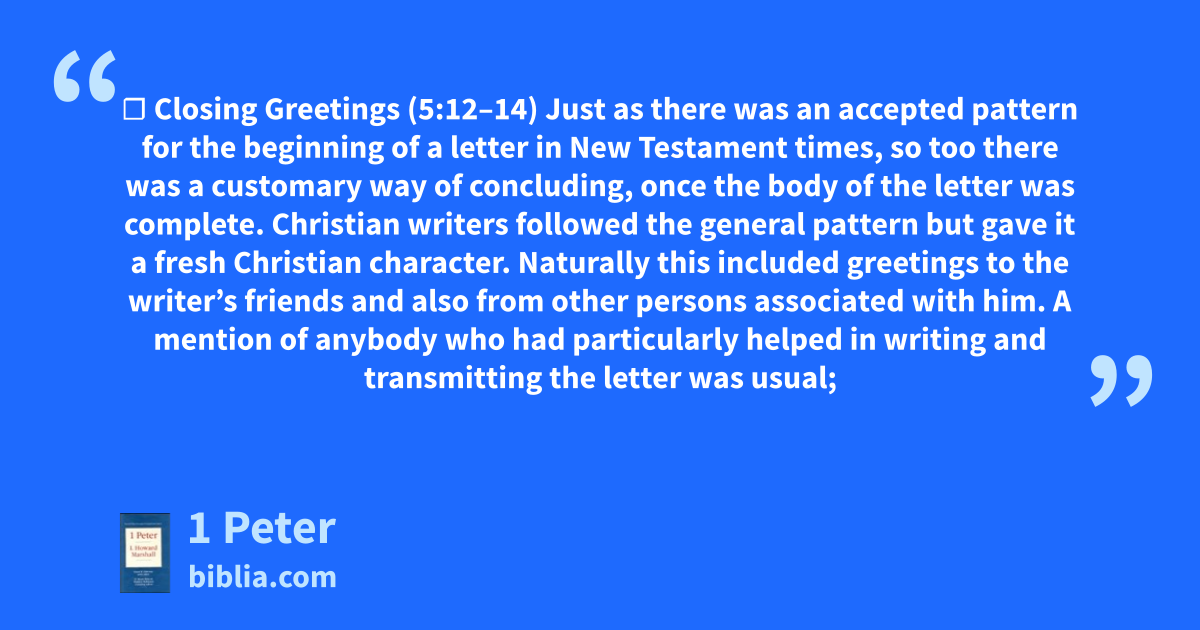 ☐ Closing Greetings (5:12–14) Just as there was an accepted pattern for the beginning of a letter in New Testament times, so too there was a customary way of concluding, once the body of the letter was complete. Christian writers followed the general pattern but gave it a fresh Christian character. Naturally this included greetings to the writer’s friends and also from other persons associated with him. A mention of anybody who had particularly helped in writing and transmitting the letter was usual;