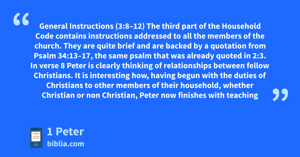 General Instructions (3:8–12) The third part of the Household Code contains instructions addressed to all the members of the church. They are quite brief and are backed by a quotation from Psalm 34:13–17, the same psalm that was already quoted in 2:3. In verse 8 Peter is clearly thinking of relationships between fellow Christians. It is interesting how, having begun with the duties of Christians to other members of their household, whether Christian or non Christian, Peter now finishes with teaching