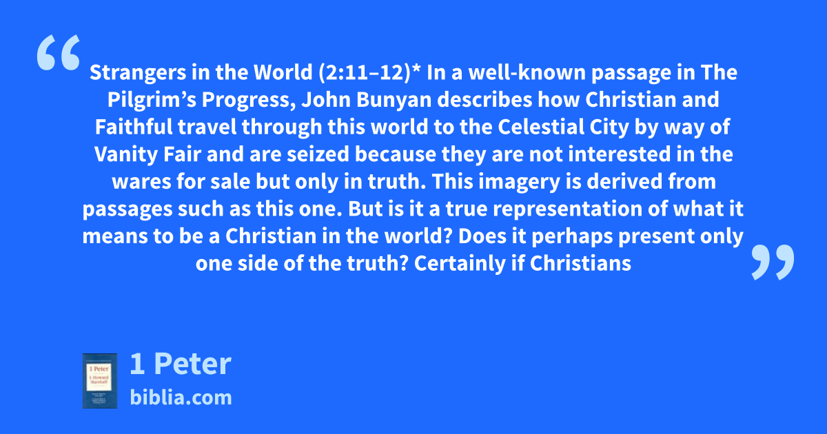 Strangers in the World (2:11–12)* In a well-known passage in The Pilgrim’s Progress, John Bunyan describes how Christian and Faithful travel through this world to the Celestial City by way of Vanity Fair and are seized because they are not interested in the wares for sale but only in truth. This imagery is derived from passages such as this one. But is it a true representation of what it means to be a Christian in the world? Does it perhaps present only one side of the truth? Certainly if Christians