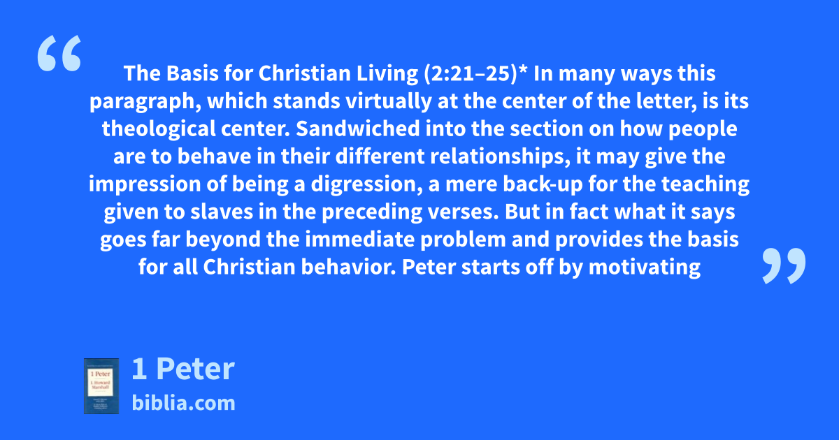 The Basis for Christian Living (2:21–25)* In many ways this paragraph, which stands virtually at the center of the letter, is its theological center. Sandwiched into the section on how people are to behave in their different relationships, it may give the impression of being a digression, a mere back-up for the teaching given to slaves in the preceding verses. But in fact what it says goes far beyond the immediate problem and provides the basis for all Christian behavior. Peter starts off by motivating