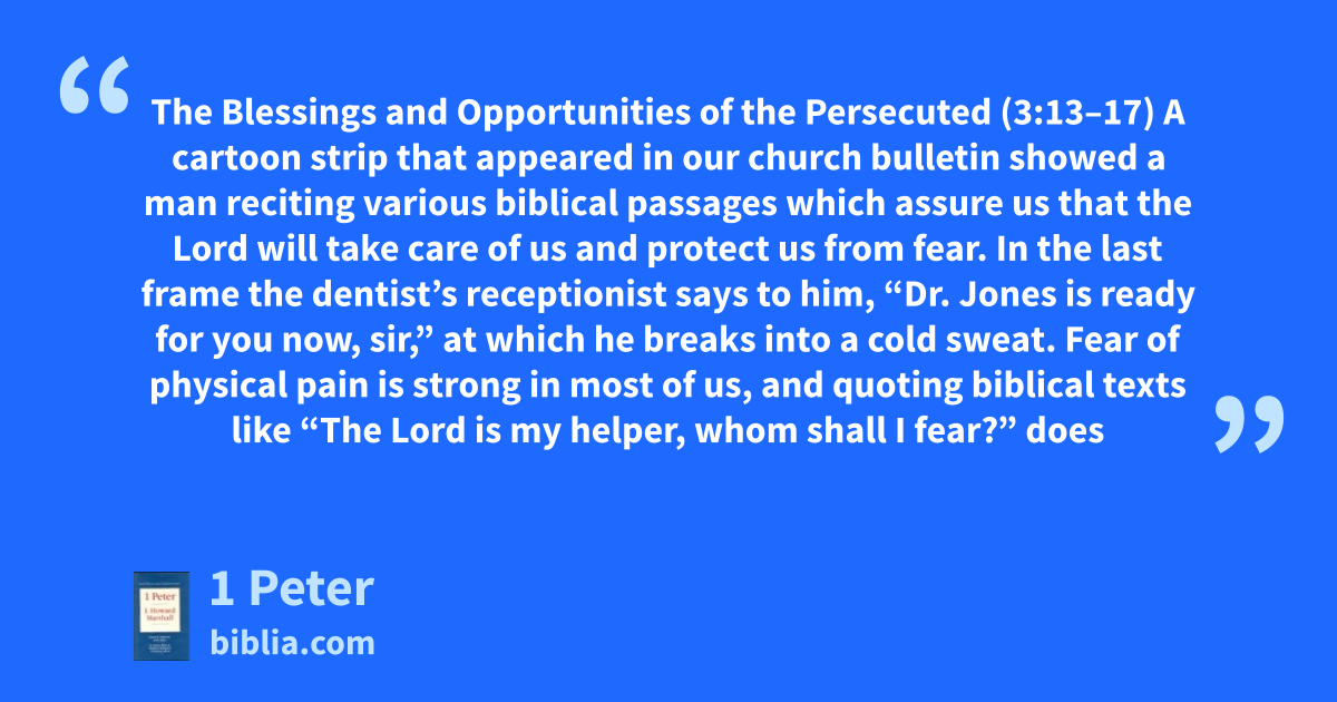 The Blessings and Opportunities of the Persecuted (3:13–17) A cartoon strip that appeared in our church bulletin showed a man reciting various biblical passages which assure us that the Lord will take care of us and protect us from fear. In the last frame the dentist’s receptionist says to him, “Dr. Jones is ready for you now, sir,” at which he breaks into a cold sweat. Fear of physical pain is strong in most of us, and quoting biblical texts like “The Lord is my helper, whom shall I fear?” does