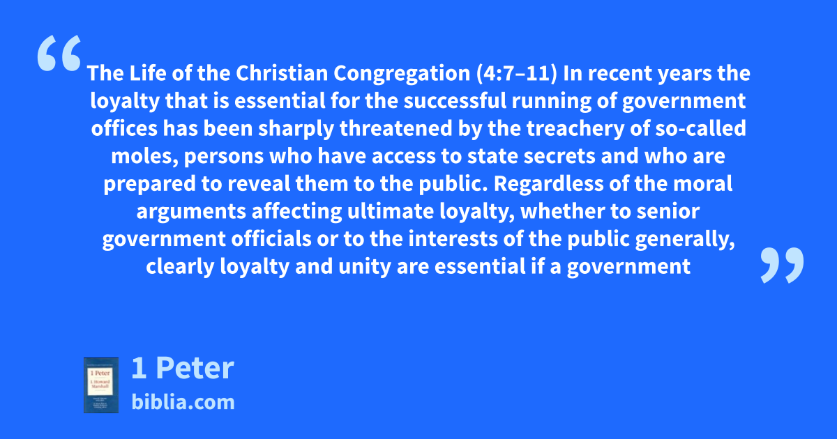 The Life of the Christian Congregation (4:7–11) In recent years the loyalty that is essential for the successful running of government offices has been sharply threatened by the treachery of so-called moles, persons who have access to state secrets and who are prepared to reveal them to the public. Regardless of the moral arguments affecting ultimate loyalty, whether to senior government officials or to the interests of the public generally, clearly loyalty and unity are essential if a government