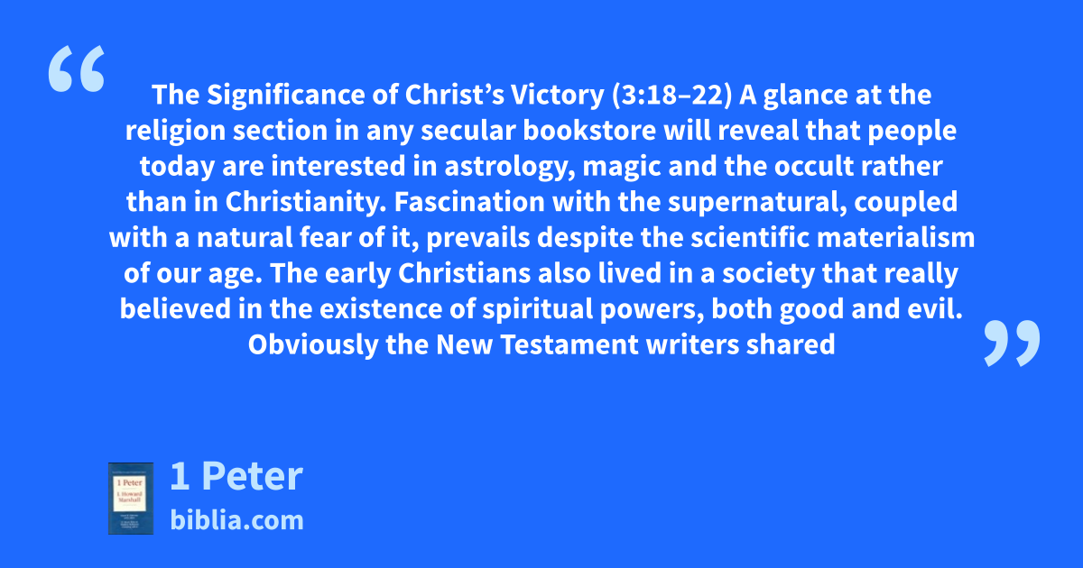 The Significance of Christ’s Victory (3:18–22) A glance at the religion section in any secular bookstore will reveal that people today are interested in astrology, magic and the occult rather than in Christianity. Fascination with the supernatural, coupled with a natural fear of it, prevails despite the scientific materialism of our age. The early Christians also lived in a society that really believed in the existence of spiritual powers, both good and evil. Obviously the New Testament writers shared
