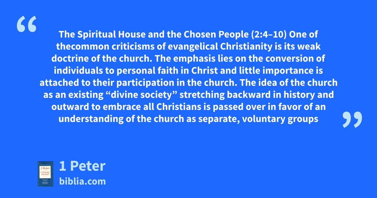 The Spiritual House and the Chosen People (2:4–10) One of thecommon criticisms of evangelical Christianity is its weak doctrine of the church. The emphasis lies on the conversion of individuals to personal faith in Christ and little importance is attached to their participation in the church. The idea of the church as an existing “divine society” stretching backward in history and outward to embrace all Christians is passed over in favor of an understanding of the church as separate, voluntary groups