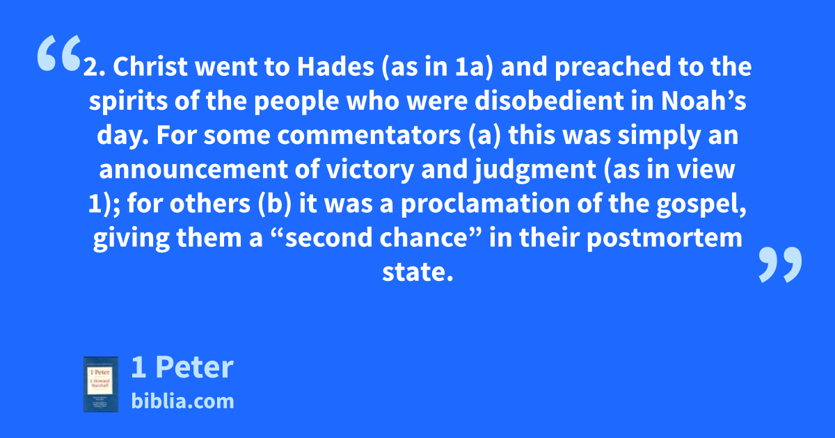 2. Christ went to Hades (as in 1a) and preached to the spirits of the people who were disobedient in Noah’s day. For some commentators (a) this was simply an announcement of victory and judgment (as in view 1); for others (b) it was a proclamation of the gospel, giving them a “second chance” in their postmortem state.