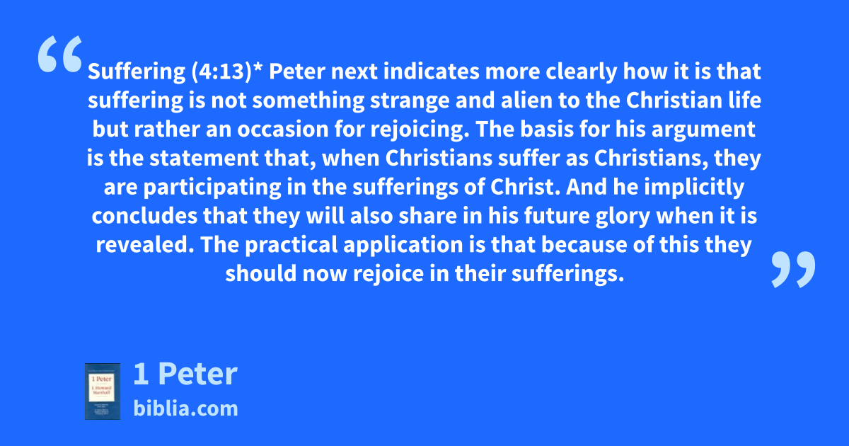 Suffering (4:13)* Peter next indicates more clearly how it is that suffering is not something strange and alien to the Christian life but rather an occasion for rejoicing. The basis for his argument is the statement that, when Christians suffer as Christians, they are participating in the sufferings of Christ. And he implicitly concludes that they will also share in his future glory when it is revealed. The practical application is that because of this they should now rejoice in their sufferings.