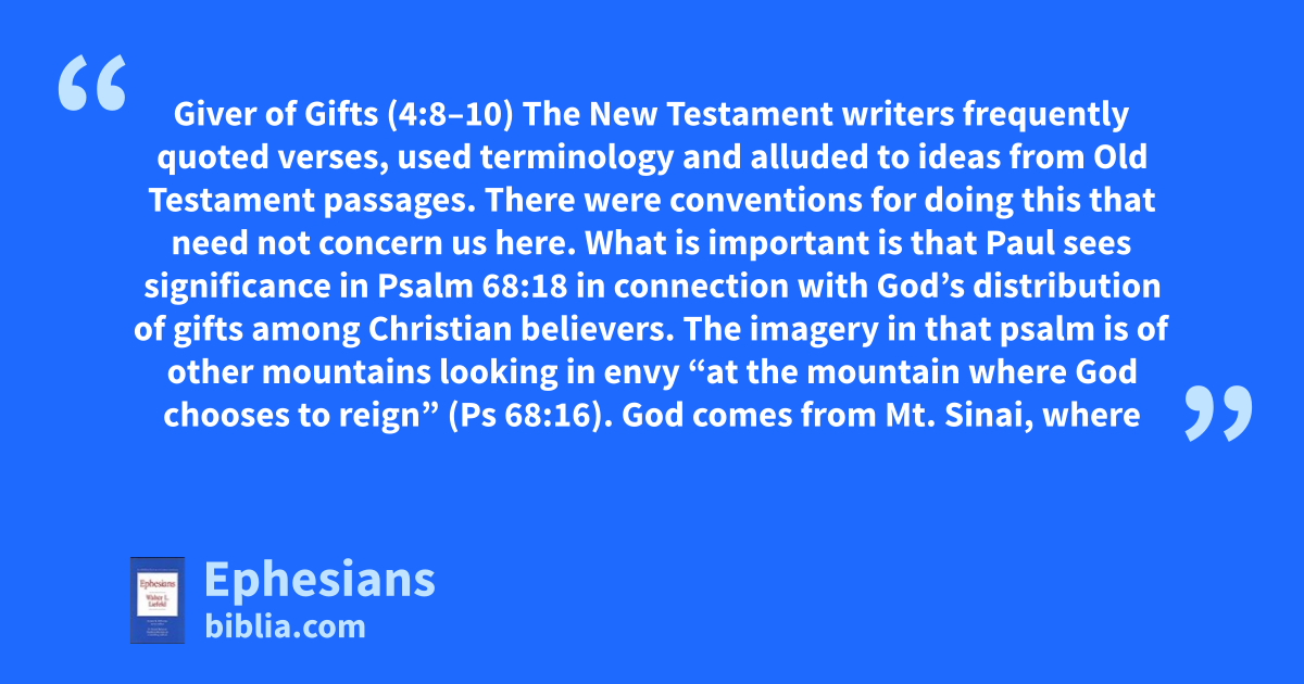 Giver of Gifts (4:8–10) The New Testament writers frequently quoted verses, used terminology and alluded to ideas from Old Testament passages. There were conventions for doing this that need not concern us here. What is important is that Paul sees significance in Psalm 68:18 in connection with God’s distribution of gifts among Christian believers. The imagery in that psalm is of other mountains looking in envy “at the mountain where God chooses to reign” (Ps 68:16). God comes from Mt. Sinai, where