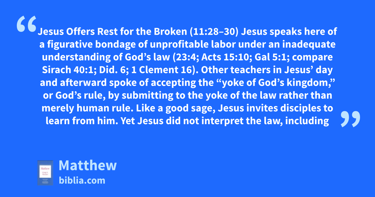 Jesus Offers Rest for the Broken (11:28–30) Jesus speaks here of a figurative bondage of unprofitable labor under an inadequate understanding of God’s law (23:4; Acts 15:10; Gal 5:1; compare Sirach 40:1; Did. 6; 1 Clement 16). Other teachers in Jesus’ day and afterward spoke of accepting the “yoke of God’s kingdom,” or God’s rule, by submitting to the yoke of the law rather than merely human rule. Like a good sage, Jesus invites disciples to learn from him. Yet Jesus did not interpret the law, including
