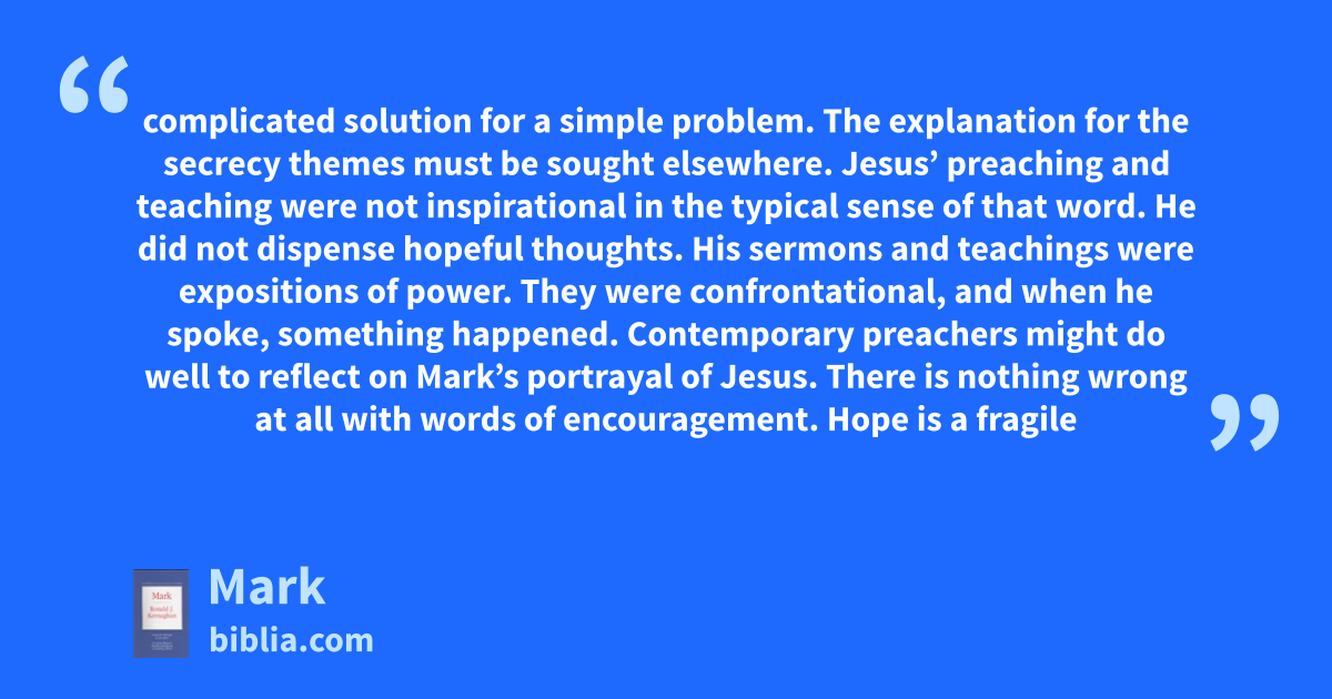 complicated solution for a simple problem. The explanation for the secrecy themes must be sought elsewhere. Jesus’ preaching and teaching were not inspirational in the typical sense of that word. He did not dispense hopeful thoughts. His sermons and teachings were expositions of power. They were confrontational, and when he spoke, something happened. Contemporary preachers might do well to reflect on Mark’s portrayal of Jesus. There is nothing wrong at all with words of encouragement. Hope is a fragile