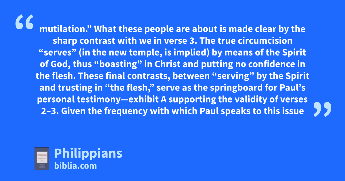 mutilation.” What these people are about is made clear by the sharp contrast with we in verse 3. The true circumcision “serves” (in the new temple, is implied) by means of the Spirit of God, thus “boasting” in Christ and putting no confidence in the flesh. These final contrasts, between “serving” by the Spirit and trusting in “the flesh,” serve as the springboard for Paul’s personal testimony—exhibit A supporting the validity of verses 2–3. Given the frequency with which Paul speaks to this issue