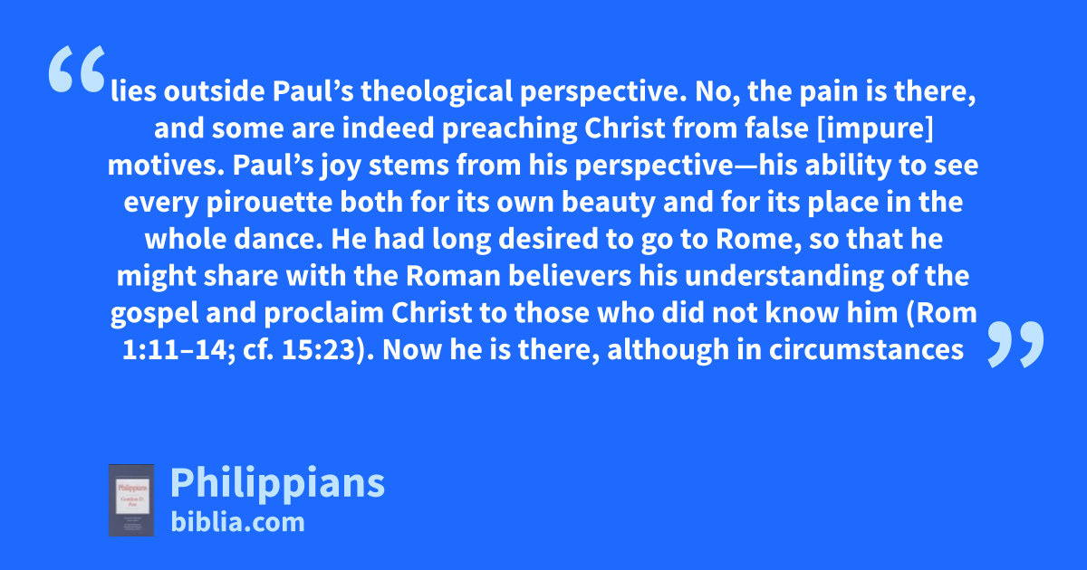 lies outside Paul’s theological perspective. No, the pain is there, and some are indeed preaching Christ from false [impure] motives. Paul’s joy stems from his perspective—his ability to see every pirouette both for its own beauty and for its place in the whole dance. He had long desired to go to Rome, so that he might share with the Roman believers his understanding of the gospel and proclaim Christ to those who did not know him (Rom 1:11–14; cf. 15:23). Now he is there, although in circumstances