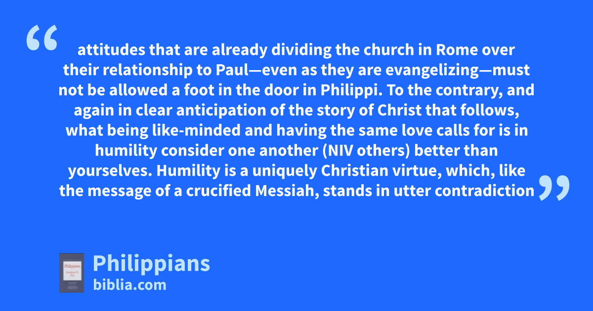 attitudes that are already dividing the church in Rome over their relationship to Paul—even as they are evangelizing—must not be allowed a foot in the door in Philippi. To the contrary, and again in clear anticipation of the story of Christ that follows, what being like-minded and having the same love calls for is in humility consider one another (NIV others) better than yourselves. Humility is a uniquely Christian virtue, which, like the message of a crucified Messiah, stands in utter contradiction