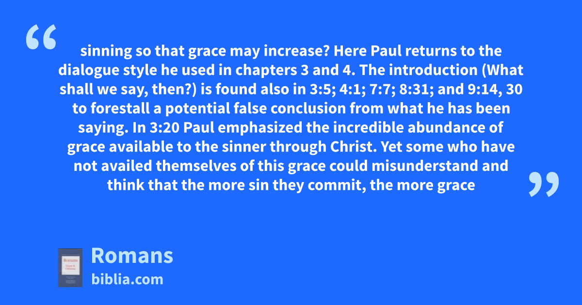 sinning so that grace may increase? Here Paul returns to the dialogue style he used in chapters 3 and 4. The introduction (What shall we say, then?) is found also in 3:5; 4:1; 7:7; 8:31; and 9:14, 30 to forestall a potential false conclusion from what he has been saying. In 3:20 Paul emphasized the incredible abundance of grace available to the sinner through Christ. Yet some who have not availed themselves of this grace could misunderstand and think that the more sin they commit, the more grace