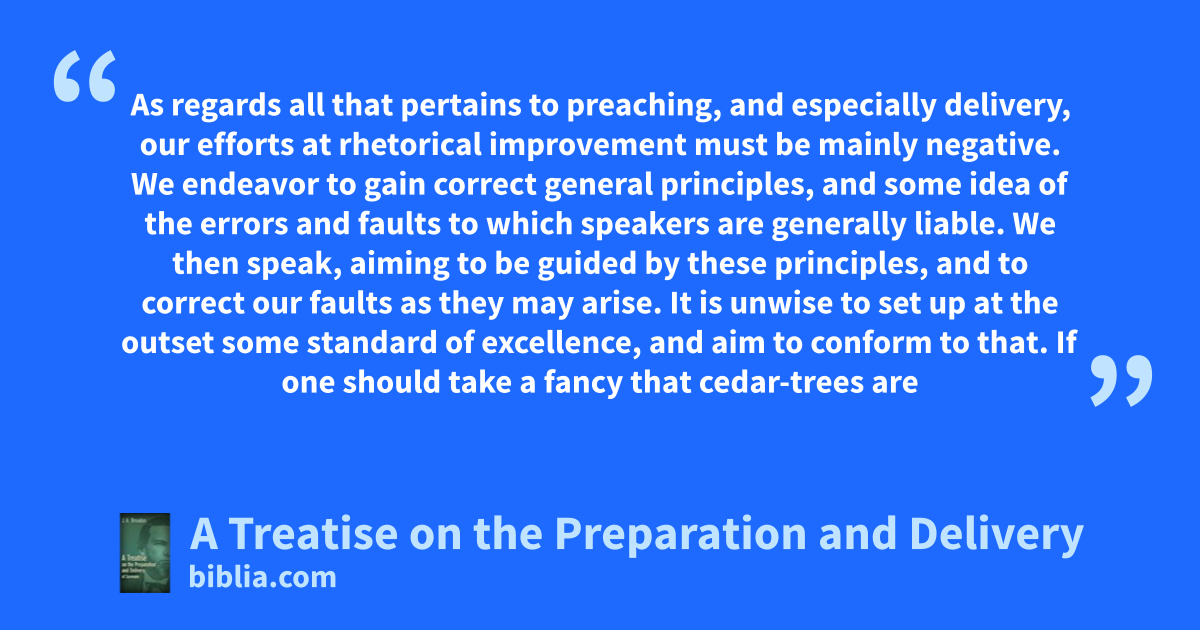 As regards all that pertains to preaching, and especially delivery, our efforts at rhetorical improvement must be mainly negative. We endeavor to gain correct general principles, and some idea of the errors and faults to which speakers are generally liable. We then speak, aiming to be guided by these principles, and to correct our faults as they may arise. It is unwise to set up at the outset some standard of excellence, and aim to conform to that. If one should take a fancy that cedar-trees are
