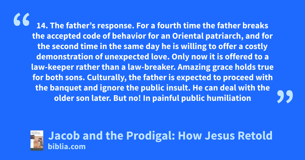 14. The father’s response. For a fourth time the father breaks the accepted code of behavior for an Oriental patriarch, and for the second time in the same day he is willing to offer a costly demonstration of unexpected love. Only now it is offered to a law-keeper rather than a law-breaker. Amazing grace holds true for both sons. Culturally, the father is expected to proceed with the banquet and ignore the public insult. He can deal with the older son later. But no! In painful public humiliation