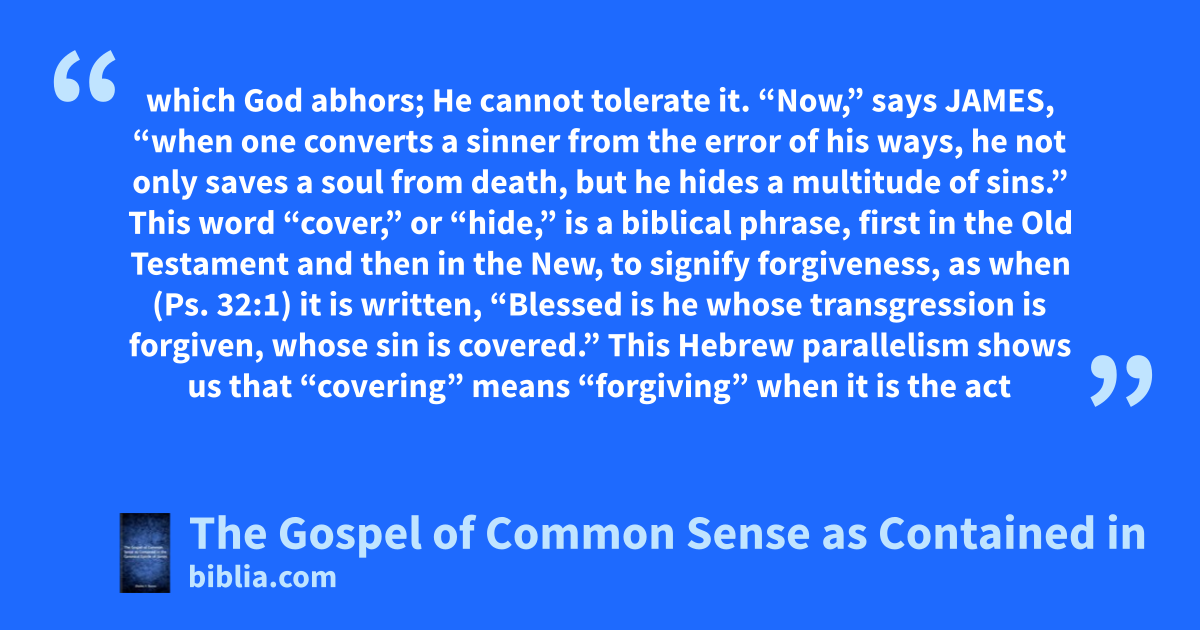 which God abhors; He cannot tolerate it. “Now,” says JAMES, “when one converts a sinner from the error of his ways, he not only saves a soul from death, but he hides a multitude of sins.” This word “cover,” or “hide,” is a biblical phrase, first in the Old Testament and then in the New, to signify forgiveness, as when (Ps. 32:1) it is written, “Blessed is he whose transgression is forgiven, whose sin is covered.” This Hebrew parallelism shows us that “covering” means “forgiving” when it is the act