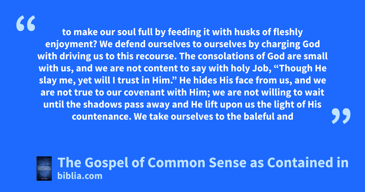 to make our soul full by feeding it with husks of fleshly enjoyment? We defend ourselves to ourselves by charging God with driving us to this recourse. The consolations of God are small with us, and we are not content to say with holy Job, “Though He slay me, yet will I trust in Him.” He hides His face from us, and we are not true to our covenant with Him; we are not willing to wait until the shadows pass away and He lift upon us the light of His countenance. We take ourselves to the baleful and