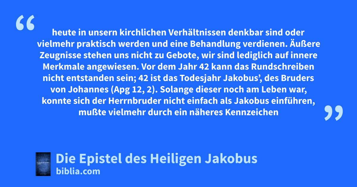 heute in unsern kirchlichen Verhältnissen denkbar sind oder vielmehr praktisch werden und eine Behandlung verdienen. Äußere Zeugnisse stehen uns nicht zu Gebote, wir sind lediglich auf innere Merkmale angewiesen. Vor dem Jahr 42 kann das Rundschreiben nicht entstanden sein; 42 ist das Todesjahr Jakobus’, des Bruders von Johannes (Apg 12, 2). Solange dieser noch am Leben war, konnte sich der Herrnbruder nicht einfach als Jakobus einführen, mußte vielmehr durch ein näheres Kennzeichen