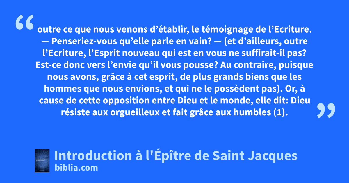 outre ce que nous venons d’établir, le témoignage de l’Ecriture. — Penseriez-vous qu’elle parle en vain? — (et d’ailleurs, outre l’Ecriture, l’Esprit nouveau qui est en vous ne suffirait-il pas? Est-ce donc vers l’envie qu’il vous pousse? Au contraire, puisque nous avons, grâce à cet esprit, de plus grands biens que les hommes que nous envions, et qui ne le possèdent pas). Or, à cause de cette opposition entre Dieu et le monde, elle dit: Dieu résiste aux orgueilleux et fait grâce aux humbles (1).