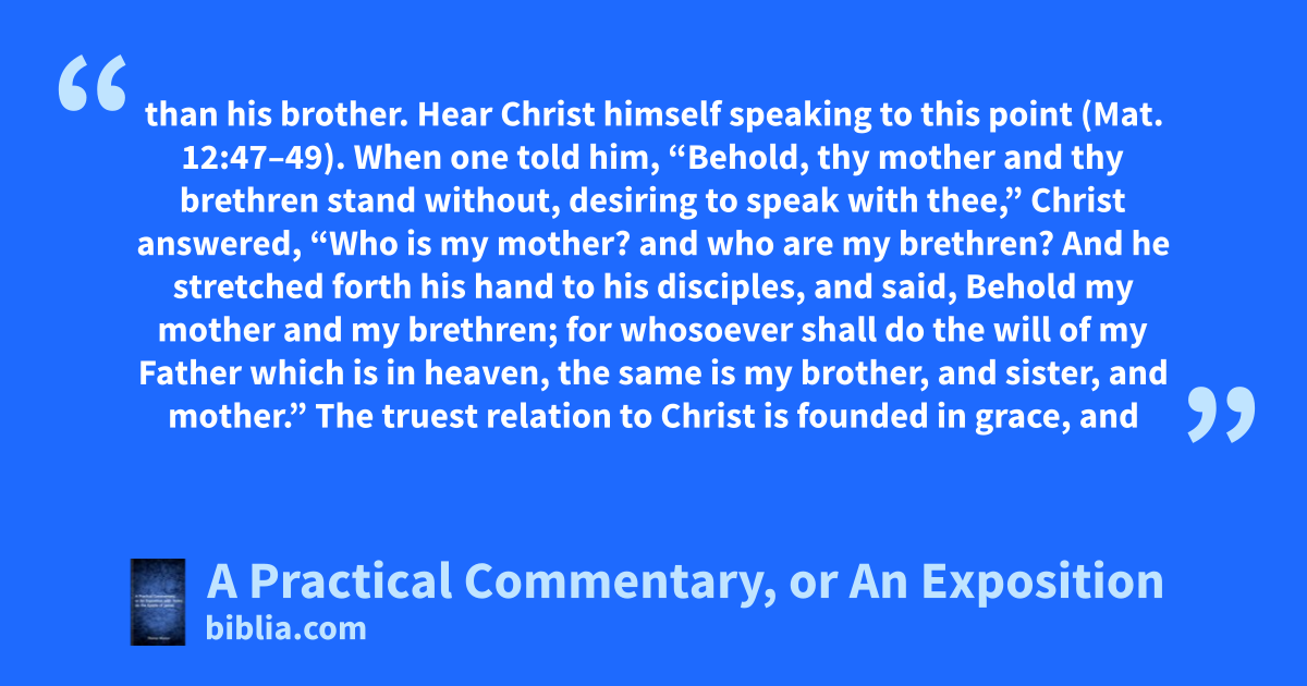than his brother. Hear Christ himself speaking to this point (Mat. 12:47–49). When one told him, “Behold, thy mother and thy brethren stand without, desiring to speak with thee,” Christ answered, “Who is my mother? and who are my brethren? And he stretched forth his hand to his disciples, and said, Behold my mother and my brethren; for whosoever shall do the will of my Father which is in heaven, the same is my brother, and sister, and mother.” The truest relation to Christ is founded in grace, and