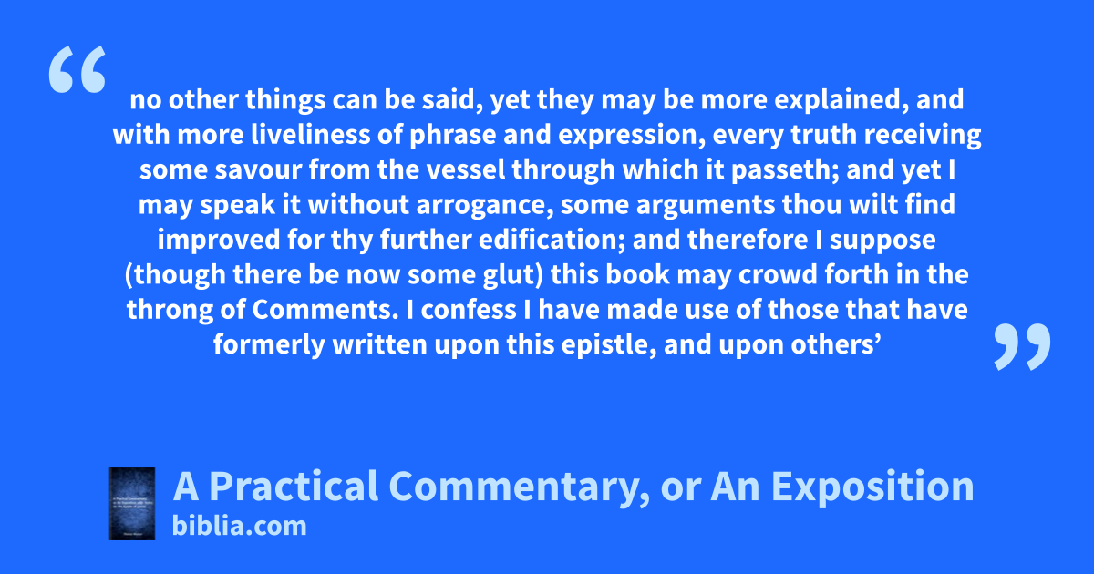 no other things can be said, yet they may be more explained, and with more liveliness of phrase and expression, every truth receiving some savour from the vessel through which it passeth; and yet I may speak it without arrogance, some arguments thou wilt find improved for thy further edification; and therefore I suppose (though there be now some glut) this book may crowd forth in the throng of Comments. I confess I have made use of those that have formerly written upon this epistle, and upon others’