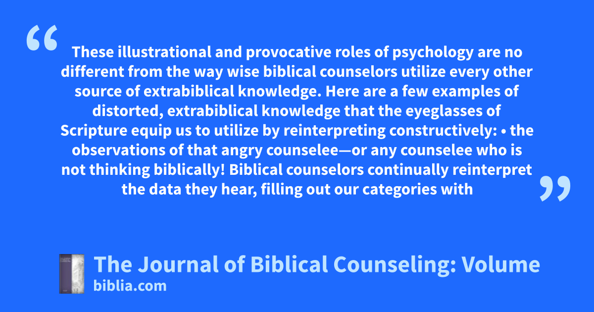 These illustrational and provocative roles of psychology are no different from the way wise biblical counselors utilize every other source of extrabiblical knowledge. Here are a few examples of distorted, extrabiblical knowledge that the eyeglasses of Scripture equip us to utilize by reinterpreting constructively: • the observations of that angry counselee—or any counselee who is not thinking biblically! Biblical counselors continually reinterpret the data they hear, filling out our categories with