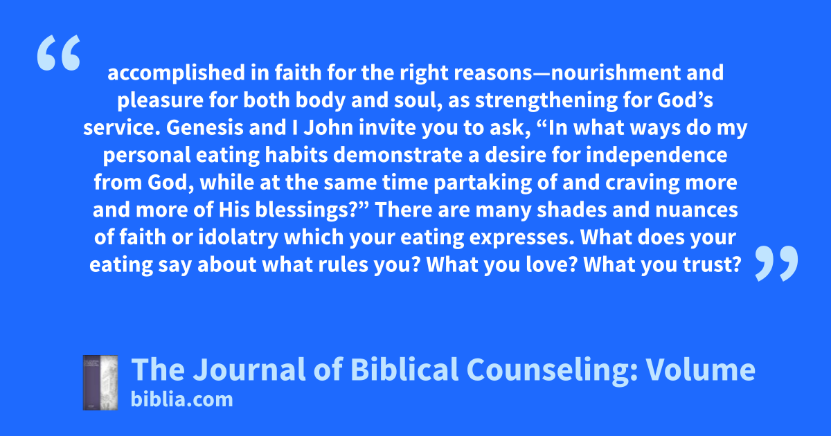 accomplished in faith for the right reasons—nourishment and pleasure for both body and soul, as strengthening for God’s service. Genesis and I John invite you to ask, “In what ways do my personal eating habits demonstrate a desire for independence from God, while at the same time partaking of and craving more and more of His blessings?” There are many shades and nuances of faith or idolatry which your eating expresses. What does your eating say about what rules you? What you love? What you trust?