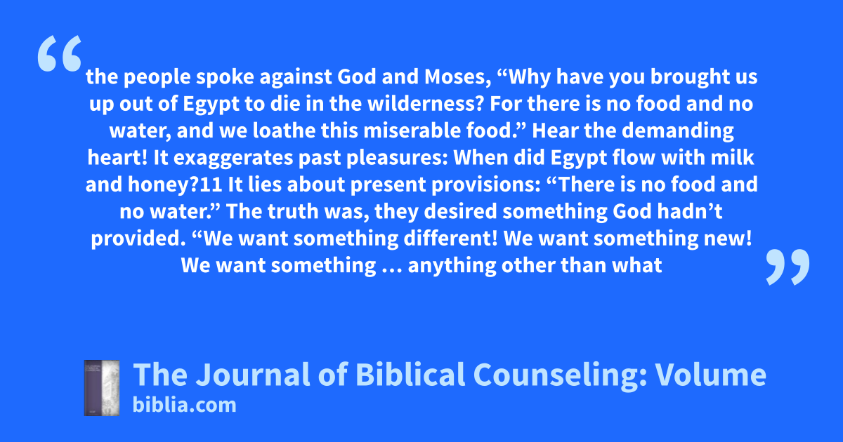 the people spoke against God and Moses, “Why have you brought us up out of Egypt to die in the wilderness? For there is no food and no water, and we loathe this miserable food.” Hear the demanding heart! It exaggerates past pleasures: When did Egypt flow with milk and honey?11 It lies about present provisions: “There is no food and no water.” The truth was, they desired something God hadn’t provided. “We want something different! We want something new! We want something … anything other than what