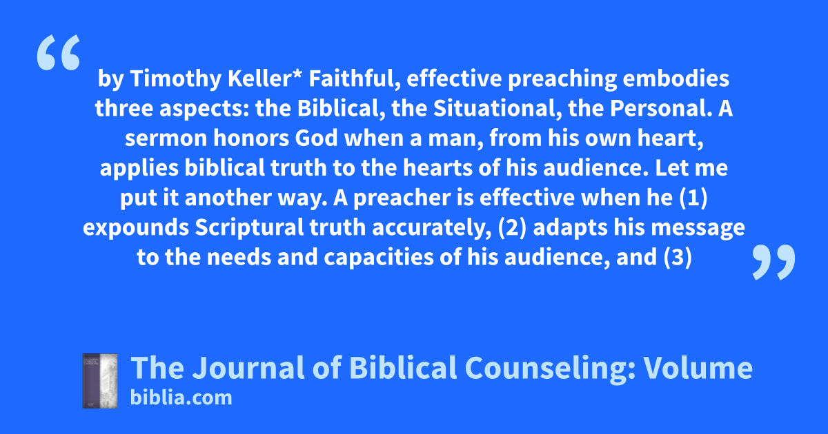 by Timothy Keller* Faithful, effective preaching embodies three aspects: the Biblical, the Situational, the Personal. A sermon honors God when a man, from his own heart, applies biblical truth to the hearts of his audience. Let me put it another way. A preacher is effective when he (1) expounds Scriptural truth accurately, (2) adapts his message to the needs and capacities of his audience, and (3)