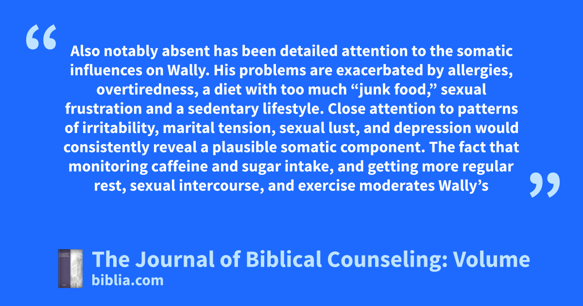 Also notably absent has been detailed attention to the somatic influences on Wally. His problems are exacerbated by allergies, overtiredness, a diet with too much “junk food,” sexual frustration and a sedentary lifestyle. Close attention to patterns of irritability, marital tension, sexual lust, and depression would consistently reveal a plausible somatic component. The fact that monitoring caffeine and sugar intake, and getting more regular rest, sexual intercourse, and exercise moderates Wally’s