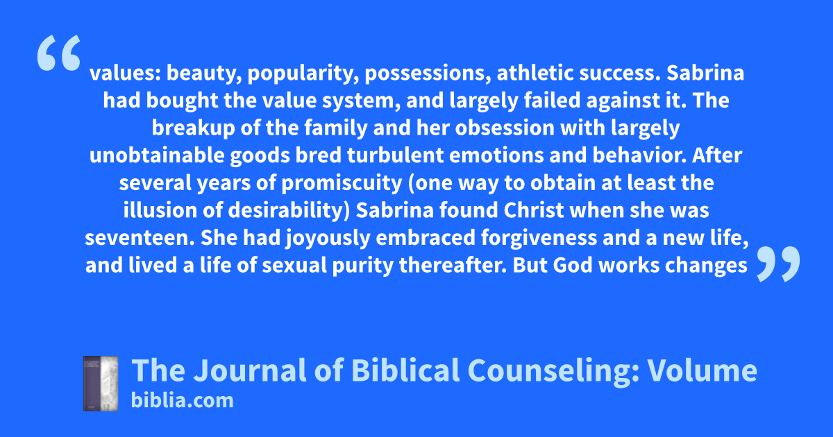 values: beauty, popularity, possessions, athletic success. Sabrina had bought the value system, and largely failed against it. The breakup of the family and her obsession with largely unobtainable goods bred turbulent emotions and behavior. After several years of promiscuity (one way to obtain at least the illusion of desirability) Sabrina found Christ when she was seventeen. She had joyously embraced forgiveness and a new life, and lived a life of sexual purity thereafter. But God works changes