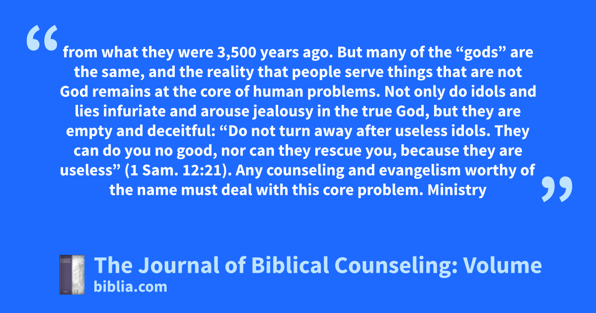 from what they were 3,500 years ago. But many of the “gods” are the same, and the reality that people serve things that are not God remains at the core of human problems. Not only do idols and lies infuriate and arouse jealousy in the true God, but they are empty and deceitful: “Do not turn away after useless idols. They can do you no good, nor can they rescue you, because they are useless” (1 Sam. 12:21). Any counseling and evangelism worthy of the name must deal with this core problem. Ministry