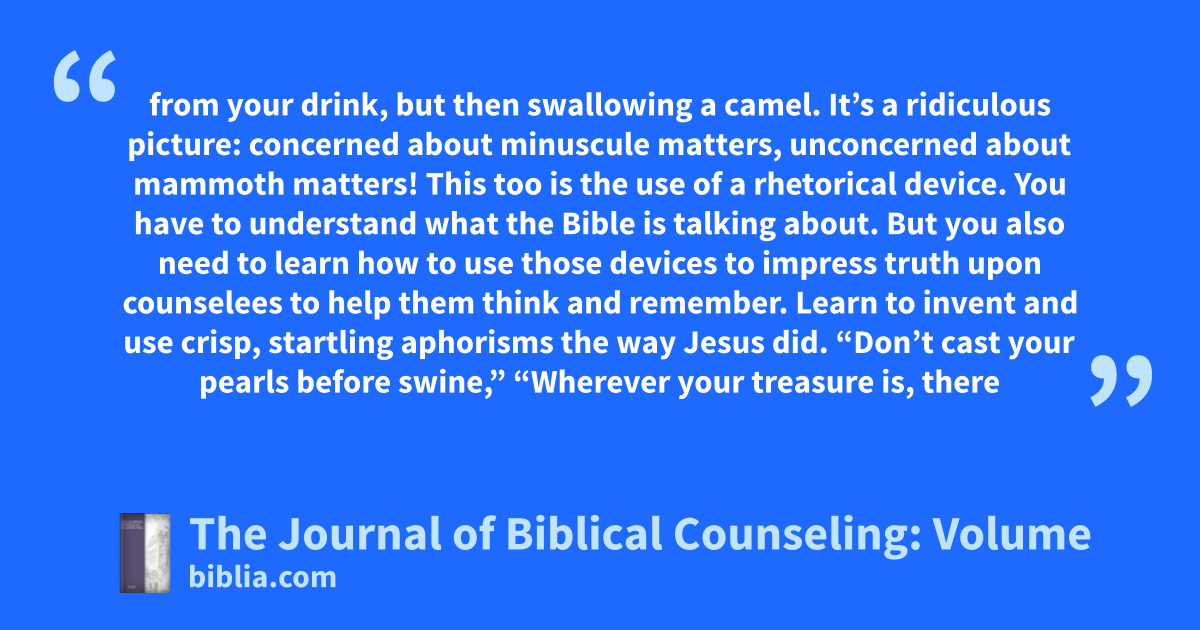 from your drink, but then swallowing a camel. It’s a ridiculous picture: concerned about minuscule matters, unconcerned about mammoth matters! This too is the use of a rhetorical device. You have to understand what the Bible is talking about. But you also need to learn how to use those devices to impress truth upon counselees to help them think and remember. Learn to invent and use crisp, startling aphorisms the way Jesus did. “Don’t cast your pearls before swine,” “Wherever your treasure is, there