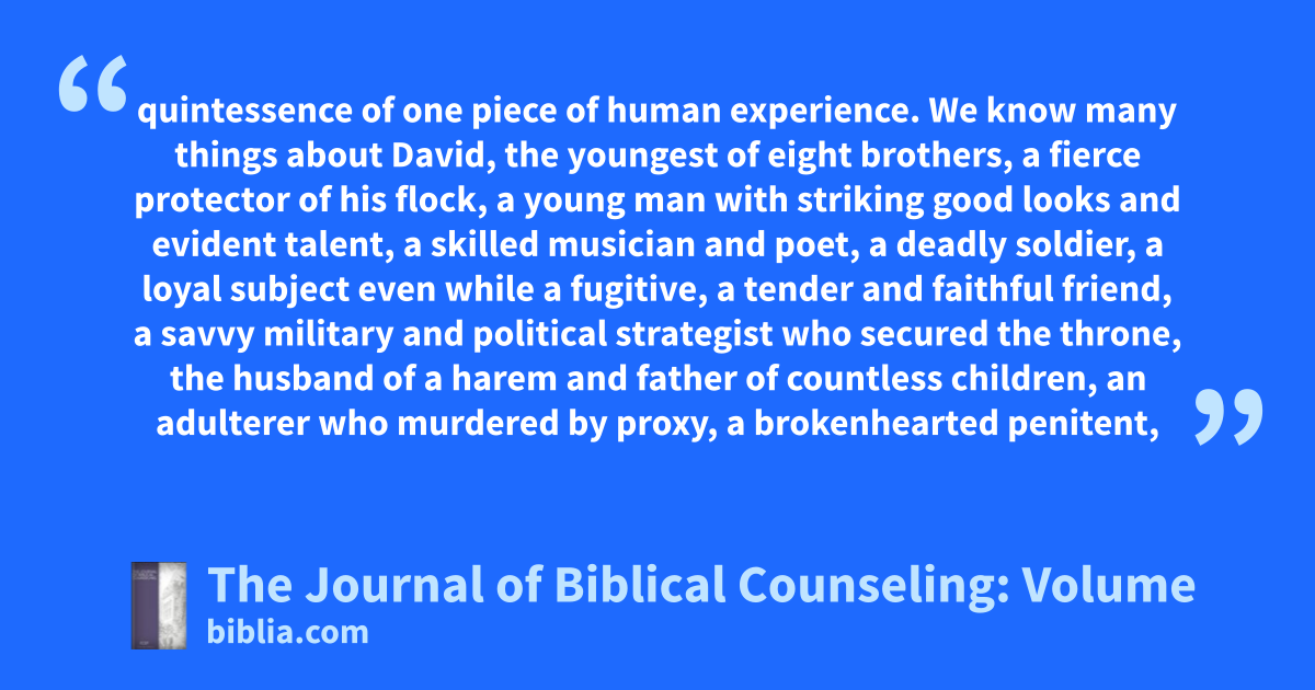 quintessence of one piece of human experience. We know many things about David, the youngest of eight brothers, a fierce protector of his flock, a young man with striking good looks and evident talent, a skilled musician and poet, a deadly soldier, a loyal subject even while a fugitive, a tender and faithful friend, a savvy military and political strategist who secured the throne, the husband of a harem and father of countless children, an adulterer who murdered by proxy, a brokenhearted penitent,